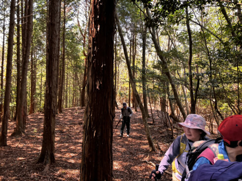 今回の山行は24名という圧倒的多数が参加する例会になり、新会員の方もおられたので、登山口で自己紹介のあと3グループに別れて出発しました。山頂まではおよそ1時間30分ほどの行程、全体的には落ち葉が道を覆い、ふかふかとした感触が心地良い登山道でした。眺望はあまりきかず、ミツバツツジの開花のピークも少し過ぎていましたが、それでも仰ぎ見る青空と新緑の輝きを愛でることができ、山頂ではにぎやかに昼食、休憩タイムを摂ることができました。