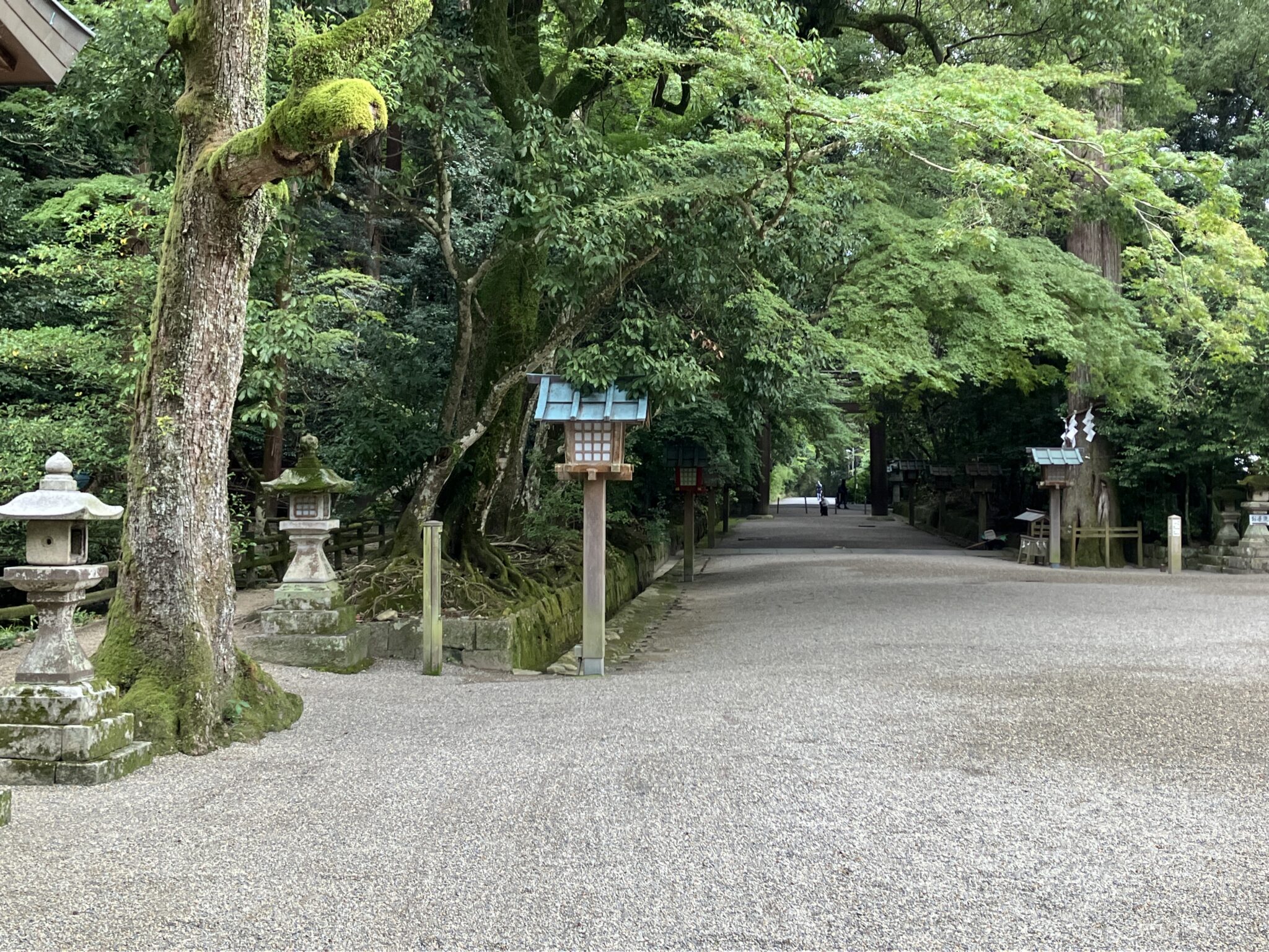 天理市にある日本屈指の古社で、南北それぞれの山の辺の道の起点になっています。境内は深い森におおわれて清浄で荘厳な佇まいを見せ、平安時代末期に建築された入母屋造り、檜皮葺きの拝殿は国宝に指定されています。