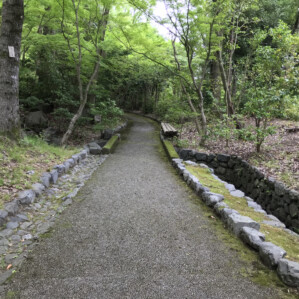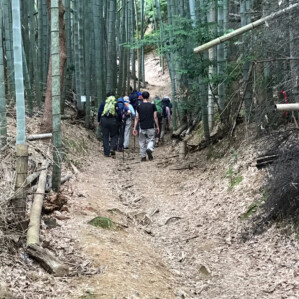 上桂の街中を抜けて10分足らずで登山口の標識があります。そこからわずかに進むと京都の風情漂う、竹林の中に「すうっと」吸い込まれていくような感覚で緩やかに高度を上げながら道は続いて行きます。